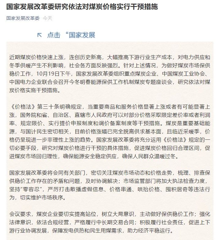 近期煤炭价格快速上涨,连创历史新高,大幅推高下游行业生产成本,对电力供应和冬季供暖产生不利影响,社会各方面反映强烈。针对上述情况,为做好煤炭市场保供稳价工作,10月19日下午,国家发展改革委组织重点煤炭企业、中国煤炭工业协会、中国电力企业联合会召开今冬明春能源保供工作机制煤炭专题座谈会,研究依法对煤炭价格实施干预措施。