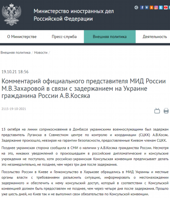 俄罗斯外交部新闻发言人扎哈罗娃当地时间10月19日表示,13日乌克兰军队在顿巴斯地区拘留了一名俄罗斯国籍公民。她表示这是对俄罗斯的挑衅行为,这个事件不仅会破坏顿巴斯地区的和平进程,更违反了乌克兰和俄罗斯签署的双边领事公约。她呼吁乌克兰方面停止在顿巴斯地区的挑衅,尽快告知俄罗斯被拘留公民的下落,并让俄罗斯外交领事官员与他会面。