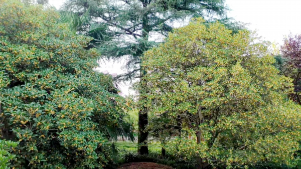 俗话说“八月桂花香满园”,但前段时间气温持续走高,淮安的桂花迟迟没有开放。淮安市楚秀园绿化科科长陈超介绍说:“桂花的花期通常在中秋节前后,但是今年受气温、光照、水分、空气湿度各方面影响,桂花盛开得比较迟,尤其是桂花对温度比较敏感,在花期前10天左右,要达到最低温度15至20度,日平均温度24度左右,昼夜温差相差大,并且最好有降雨的辅助,桂花才会开放,因为最近气温下降,秋雨降临,桂花这才终于迎来盛花期。” 丛桂怒放,芳香扑鼻,令人神清气爽。除了常见的金桂之外,桂花还分为丹桂、银桂以及四季桂,分别呈现不同的色彩之美。陈超说:“桂花的最佳观赏期大约有20天,一直到本月底都是观赏的最佳时期,我们欢迎各位市民朋友前来欣赏桂花的独特之美。”