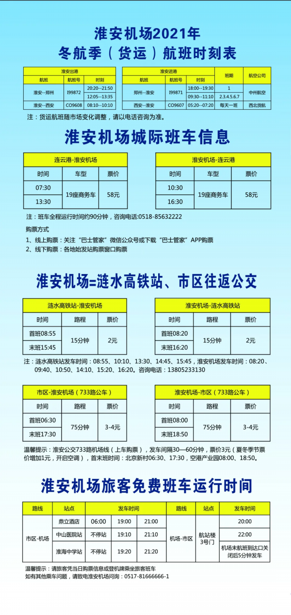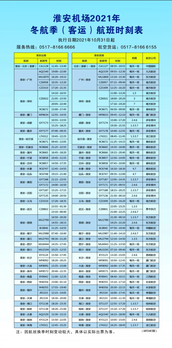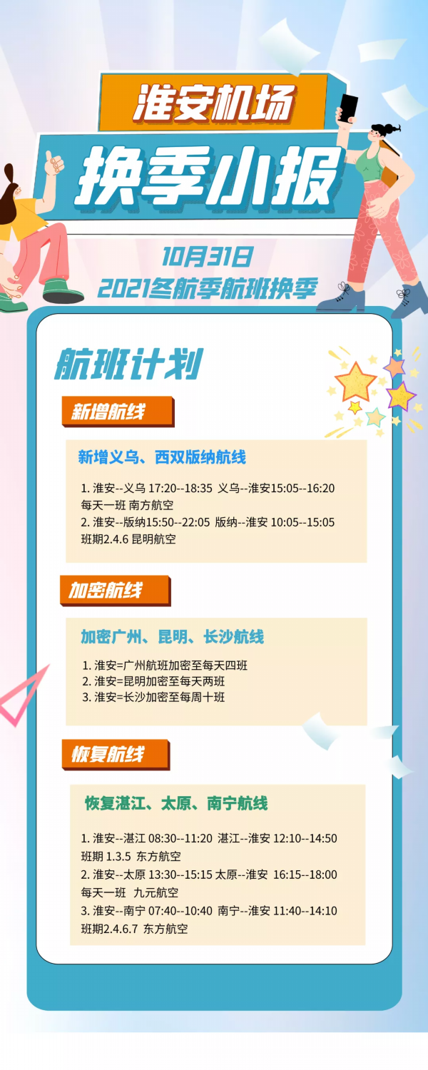 2021年10月31日起,淮安机场将执行冬航季航班计划,通航城市覆盖北京(首都)、深圳、广州、重庆、成都、武汉、宁波、长沙、泉州、桂林、福州、大连、海口、温州、昆明、长春、沈阳、厦门、石家庄、南昌、哈尔滨、南宁、贵阳、珠海、兰州、西宁、汕头等34个国内热点城市。