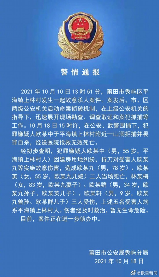 10月18日,福建省莆田市秀屿区平海镇上林村重大刑事案件犯罪嫌疑人欧某中,于上林村附近一山洞拒捕并畏罪自杀,经送医院抢救无效死亡。最近两天,网传欧某中89岁的母亲也相继去世。20日,极目新闻记者从欧某中女儿处获悉,此事不实。