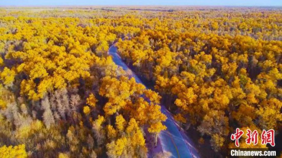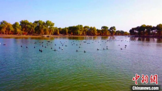 中新网乌鲁木齐10月20日电 (王小军 刘雨珊 吐尔逊·吾斯曼)10月,位于新疆巴州轮台县的塔里木胡杨林国家森林公园100余平方公里的原始胡杨林迎来最佳观赏季,金色胡杨与蓝天、大漠、水鸟、湖泊交相辉映。