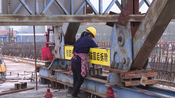 上午,记者在通扬运河泰州京泰大桥项目现场看到,工人们正在进行主桥的挂篮拆除、引桥桥面的湿接缝施工和护栏施工。
