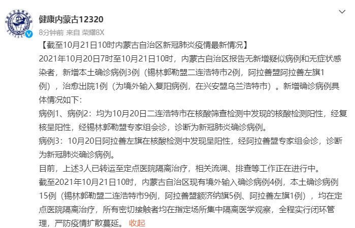 荔枝新闻讯 据“健康内蒙古12320”微博消息,2021年10月20日7时至10月21日10时,内蒙古自治区报告无新增疑似病例和无症状感染者,新增本土确诊病例3例(锡林郭勒盟二连浩特市2例,阿拉善盟阿拉善左旗1例),治愈出院1例(为境外输入复阳病例,在兴安盟乌兰浩特市)。新增确诊病例具体情况如下: