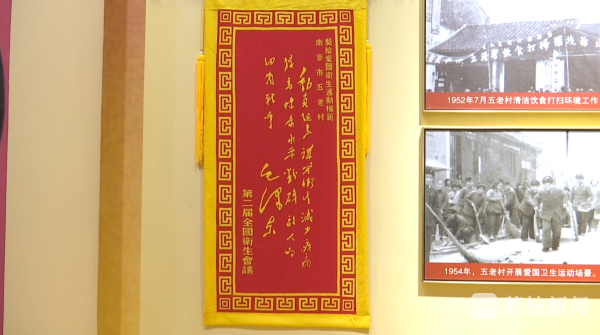 展厅内,一面锦旗光彩夺目,建国初期,五老村曾一度被市民称为“苦恼村”,环境卫生差,蚊蝇滋生,疾病流行。五老村居民积极响应党和国家开展“爱国卫生运动”的号召,自发组织起来改善环境,1952年,在第二届全国卫生会议上被授予了这面锦旗。五老村爱国卫生运动纪念馆讲解员尚亚萍说,1952年,大战一百天,填平两条七十多丈的臭水沟,运走了数十年上千吨的垃圾,还填平了三十七个臭水塘,二十九个粪坑,在全民动员的工作之下,五老村街道的环境卫生有了翻天覆地的变化。