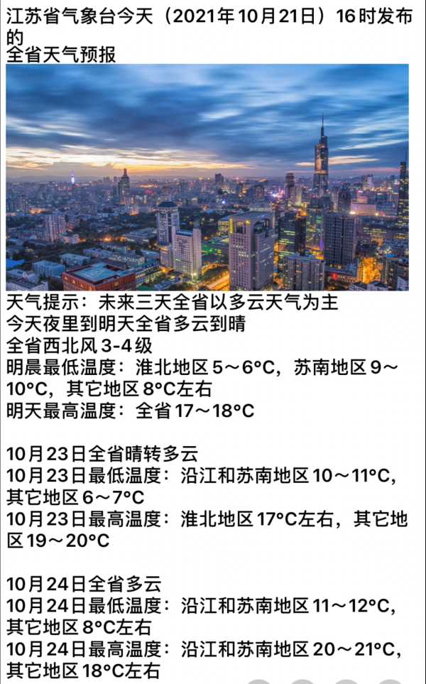 天气提示:未来三天全省以多云天气为主。今天夜里到明天全省多云到晴,全省西北风3-4级。明晨最低温度:淮北地区5~6℃,苏南地区9~10℃,其它地区8℃左右。明天最高温度:全省17~18℃。