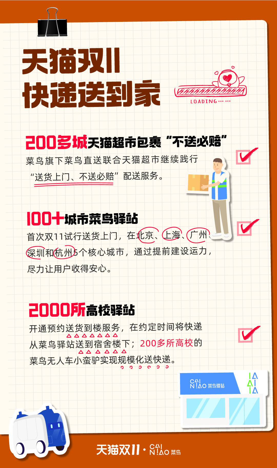 “美好生活,共同向往”天猫双11正式开启,10月22日,菜鸟宣布今年双11送货上门相关动作:菜鸟直送在200多城“不送必赔”、百城千校菜鸟驿站送货上门,让双11物流体验继续“又快又好”。