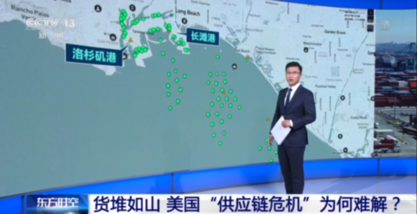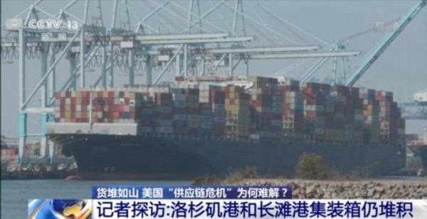 央视记者 许弢:这是全美最繁忙的货运港口的洛杉矶港。据港口方面公布的信息显示,在当地时间10月20日,这里的在港货船有24艘,排队等待进港的货船有11艘。但从船上卸载下来的集装箱已经堆满了码头。