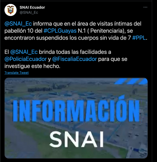当地时间10月23日,厄瓜多尔监狱管理部门通过社交媒体表示,该国南部城市瓜亚基尔一所监狱再次发现7具尸体。尸体是在用于亲属探访的私密区域被发现的,目前厄瓜多尔警方已经介入调查,官方并未透露更多细节。