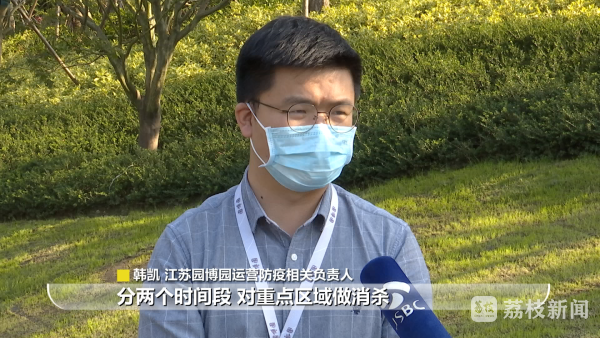 入口管控是景区疫情防控的第一道关口。在景区内部,各场所的消杀也是防疫工作的重中之重。园博园运营防疫相关负责人韩凯介绍,园区物业公司每天早上9点和下午2点,分两个时间段对重点区域消杀,主要包括卫生间、重点游览区域、园内座椅等。园区安保人员全天候巡逻,提醒游客戴好口罩。