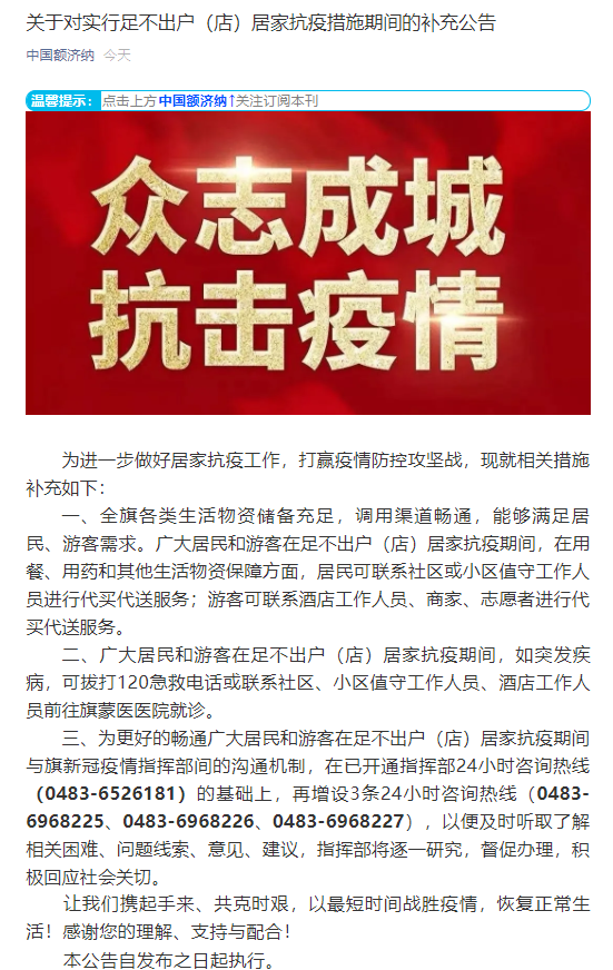荔枝新闻讯 据“中国额济纳”微信号消息,当前,额济纳旗新冠病毒感染肺炎疫情传播迅速,危害性大,为了您和家人以及他人的健康,自2021年10月25日零时起,将对广大居民和游客实行足不出户(店)的居家抗疫措施,如有异常,请及时报告社区、酒店或旅行团负责人。不听劝阻擅自外出并造成严重后果者,将依照法律法规严格追究民事、刑事责任。疫情当前,人人有责,让我们众志成城,共同打赢疫情防控攻坚战!