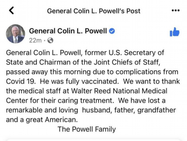 鲍威尔的助理不得不在《纽约客》上表示,虽然接种了疫苗,但鲍威尔长期患有多发性骨髓瘤(multiple myeloma)和帕金森症(Parkinson's disease)。由于受到变种病毒的“突破性”传染,机体的抵抗力大大下降。