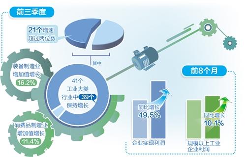 前三季度,我国工业生产保持增长,规模以上工业增加值同比增长11.8%,41个工业大类行业中39个保持增长,21个增速超过两位数。其中,装备制造业增加值增长16.2%,对整体工业增长的贡献率超过四成;消费品制造业增加值增长11.4%,4月份以来增速总体保持回升态势。
