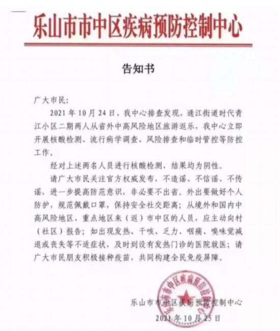 10月25日9时11分,“乐山发布”发布消息称,10月24日,乐山市市中区疾病预防控制中心排查发现,通江街道时代青江小区二期两人从省外中高风险地区旅游返回乐山,该中心立即开展核酸检测、流行病学调查、风险排查和临时管控等防控工作。经对上述两名人员进行核酸检测,结果均为阴性。
