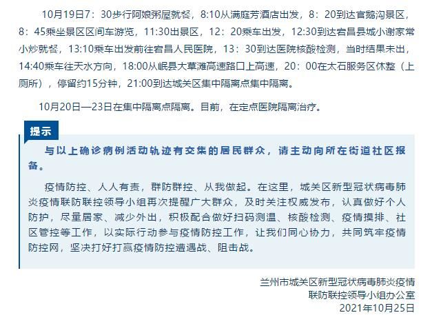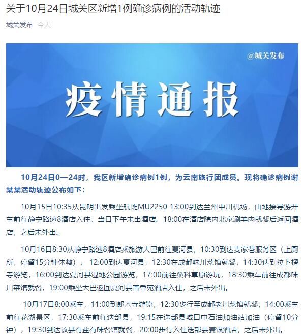 荔枝新闻讯 据“城关发布”微信公众号消息,10月24日0—24时,兰州城关区新增确诊病例1例,为云南旅行团成员。现将确诊病例谢某某活动轨迹公布如下: