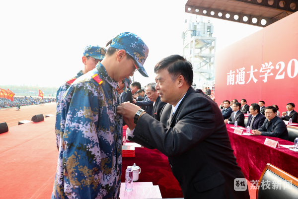 活动现场,南通大学校领导还为新生代表佩戴校徽,并赠书《习近平与大学生朋友们》。