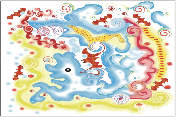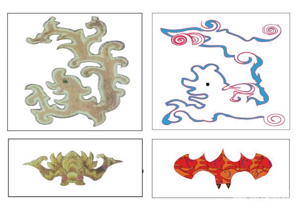 这幅《流云百福》,设计者提取了中国传统戏服里的蝙蝠和金丝猴动物刺绣纹样,用新技术手段重新呈现,赋予了新图形“吉上加吉”的寓意。江苏开放大学设计学院学生唐梦倩介绍,“蝙蝠的'蝠'字与'福'同音,寓意着幸福如意,金丝猴运用了龙的设计思路,是一种图腾,象征着民族精神。”
