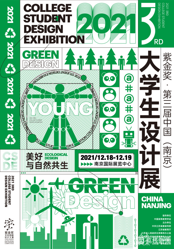紫金奖·第三届中国(南京)大学生设计展,首次将"生态文明"作为关注焦点,鼓励参赛参展者围绕人与自然、生态环保、资源再生、安全健康等领域展开深入思考与设计创作,让大学生通过设计展成为绿色风尚的倡导者、践行者、传播者。江苏开放大学党委副书记金丽霞介绍,学校这次参展参赛作品,来自设计学院、艺术学院、建筑工程学院,学生们通过创新创意作品,去表达生活与自然共生,美好与生活相遇,“未来学校将一如既往为学生成长搭建平台,形成课程育人、活动育人、环境育人的合力,切实加强学生创新能力的培养。”
