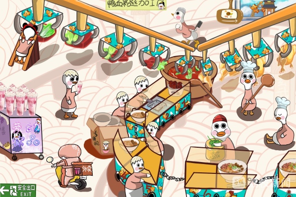 南京向以鸭肴驰誉海内。陈益畅的设计作品《古朝鸭食记》,有二三十种卡通形象,为食客在品尝美食时,增添了一丝情趣,“我设计的鸭子卡通形象,都有不一样的表情,它们代表着和鸭子相关的食物,有不一样的风味。”