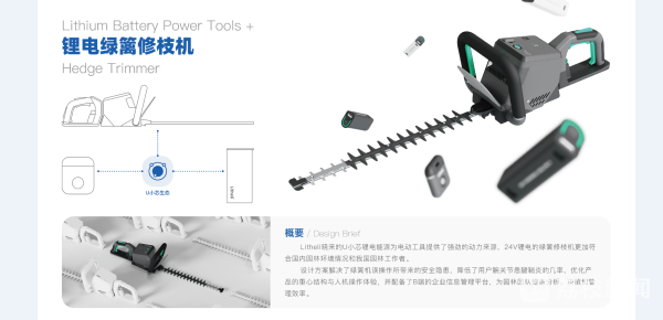 设计在于实用。这款锂电绿篱修枝机,专为园林工人设计,与传统修枝机相比,不仅轻便、实用、智能,还考虑到了对使用者的保护。南京农业大学工业设计专业学生李华天介绍,“它有一个非常完备的B端平台,这个平台可以告诉我们,比如说这个机器哪儿坏了,包括谁用了,它非常方便企业的管理,可以提高企业的管理效率。”