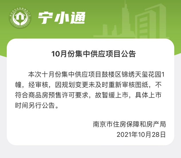 据悉,南京市住房保障和房产局发布公告,10月份9家集中供应楼盘之一的鼓楼中冶锦绣天玺,因规划变更未及时重新审核图纸,因此不符合预售要求,被暂缓入市。