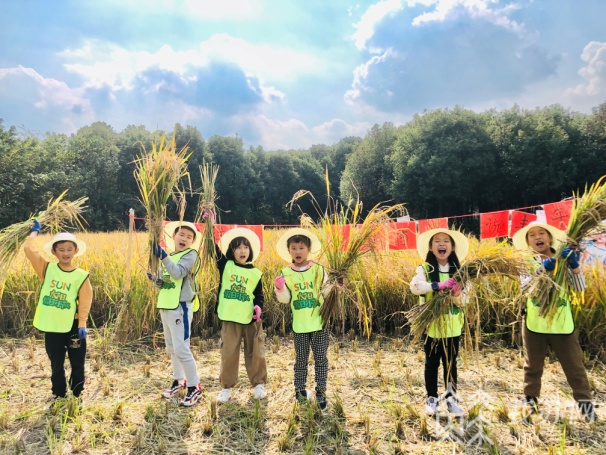 金灿灿的稻田里,小朋友们忙碌的身影,其乐融融的景象在这里形成了一道美丽的风景线。孩子们亲身体验收稻、打谷,懂得了稻谷收割是怎么回事,了解了农民伯伯的辛苦,纷纷感叹“原来我们吃的大米是这样来的。”