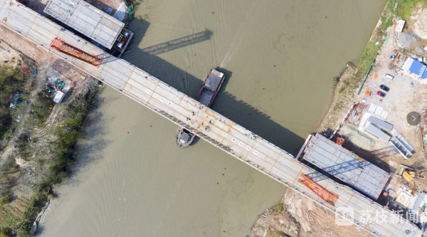 当天,记者在桥梁合龙现场看到,上方的工人们正紧张作业,下方船只在河面上畅通无阻,施工没有给河道通航带来一丝干扰。