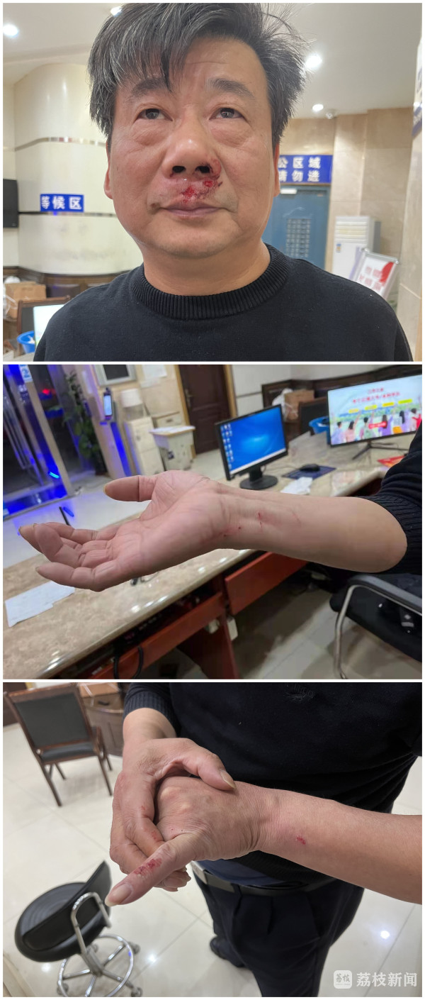 此时,派出所同事才发现几名民警辅警都挂了彩。田野左小腿出现了一道3公分的血痕,裤子被划破;程建国嘴唇上有2块肉被刮掉,鲜血直流,手臂和手掌也被擦伤,裤子擦破了几个洞;刘春生头上肿起了一个大包,并渗出了血。