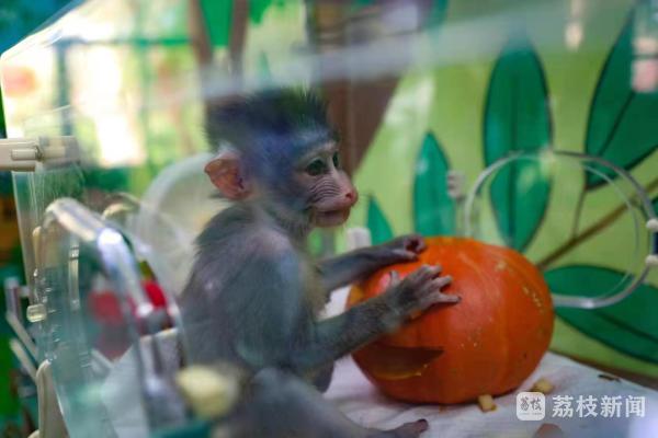满月的“鬼鬼”除了皮肤泛着淡淡的蓝色之外,其他颜色特征还没有十分明显,在小动物幼儿园内,饲养员将它的小窝布置成万圣节南瓜风格,山魈属于杂食性动物,但是年幼的“鬼鬼”还处于喝奶阶段,所以成为玩具的南瓜被它抱着又滚又啃,活泼好动的样子可爱极了!据饲养员介绍,“鬼鬼”刚出生阶段一天6顿奶,满月后开始尝试喂养一些细腻的苹果泥、红薯泥等易消化的食物,等到山魈宝宝愿意吃辅食后就可以开始减少奶量并适量进食一些提子、胡萝卜等蔬果。