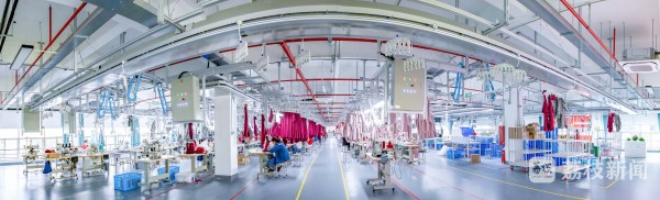 走进爱慕新建成的“创工厂”生产车间,记者看到缝制、粘合等多种岗位分布其中,一件件半成品正“搭乘”着不同的吊挂轨道在这些岗位之间穿梭,前往自己专属的下一道“站”。