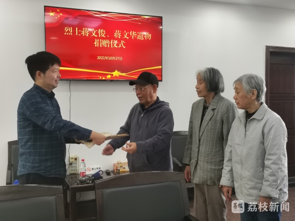 活动中,烈士家属将烈士的遗照、牺牲证明、公函、奖状等11件遗物捐赠给了常熟市烈士陵园管理处。蒋文俊、蒋文华是常熟赵市人。1939年,蒋文俊参加了由任天石领导的梅北区常备队,之后又参加了新四军六师十八旅五十三团。1944年,蒋文俊被调至高邮游击队任副连长,1945年在高邮地区牺牲,年仅26岁。1949年5月,蒋文俊的弟弟蒋文华入伍,后加入中国人民志愿军高炮十四团。1951年,蒋文华牺牲在了朝鲜战场,年仅29岁。烈士家属蒋纪昆说:“让它们回归到常熟的烈士陵园,让后人能够瞻仰他。能够继承这个革命的传统,对我们来讲也是一个很好的教育。”