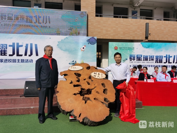 今天,南京林业大学森林培育学教授、中国工程院院士曹福亮代表团队向北京东路小学捐赠了具有特殊纪念意义的礼物——银杏木圆盘和《听伯伯讲银杏》等书籍。