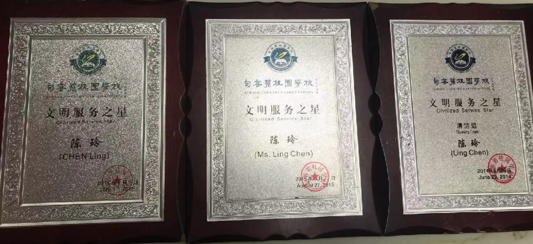 自工作以来,共获得8次优秀员工的荣誉。因机动组负责外部环境和公共区域的卫生打扫工作,经常会捡到学生或是老师丢失的物品,小到饭卡,衣服,书包,大到几百,几千不等的手表,她都会第一时间上交主管通知失主认领,受到过总务办公室给予的拾金不昧奖金和表扬,给我们环境部带来极好的口碑。