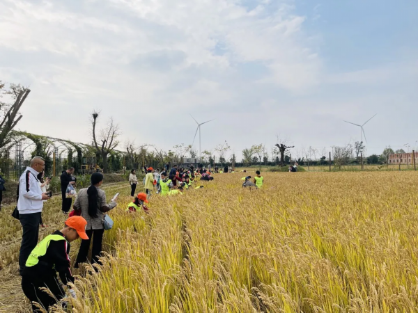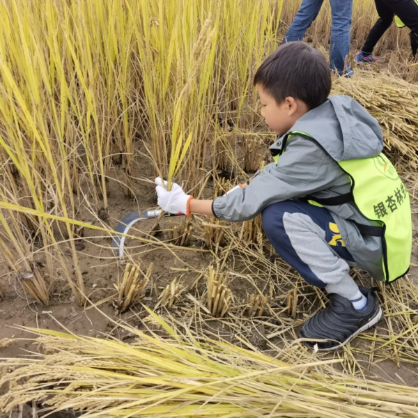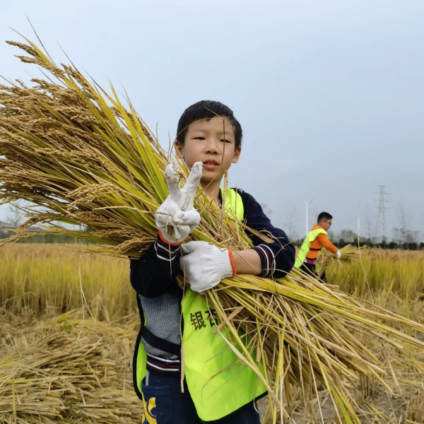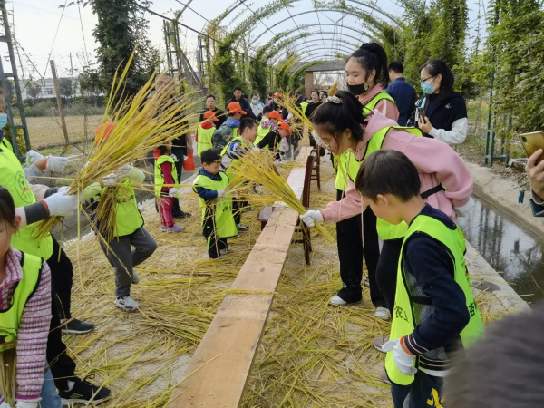 不远处传来欢快的、有节奏的“啪、啪、啪......”的声响,原来学生们在跟着农民伯伯学习非机械化时代的稻穗脱粒法,使用的工具是一排架空的厚木板。学生们一次次用尽全力将手中的稻穗甩向木板,金黄的谷粒纷纷洒落。“春种一粒粟,秋收万颗子”,学生们的欢声笑语载着丰收的喜悦之情传遍了田间每一个角落。