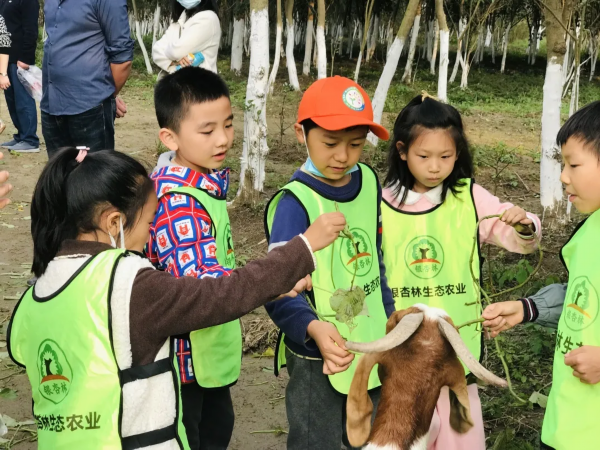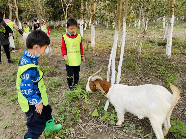 来到小树林,学生们远远地看到成群的小羊,迫不及待地抱着早已准备好的紫薯叶飞奔过去。小羊们也不怕生,一拥而上,美滋滋地享用着学生们手中的美餐。