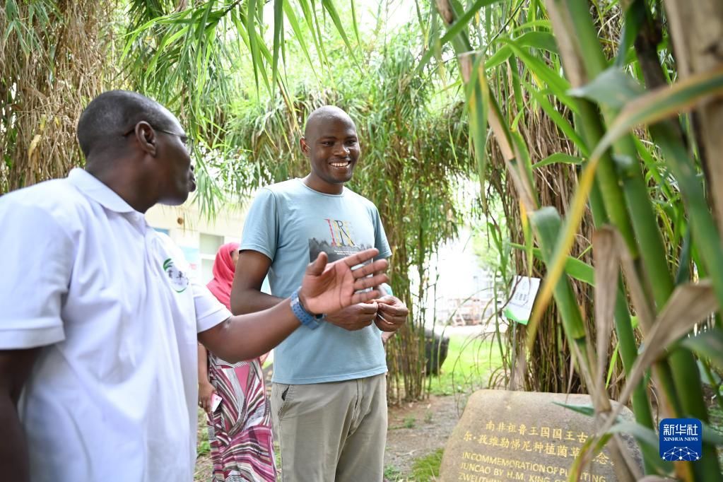 8月12日,尼日利亚留学生拉瓦迪·达蒂(左一)和肯尼亚留学生艾亚利拉·雅各布·奥卡尔在福建农林大学的“国际菌草苑”交流菌草栽培技术。新华社记者 林善传 摄