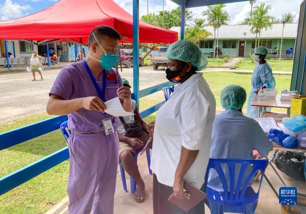8月25日,在巴布亚新几内亚新爱尔兰省卡维恩总医院,中国援巴新医疗队队员向当地医护人员介绍疫苗接种注意事项。新华社发(中国援巴新医疗队供图)