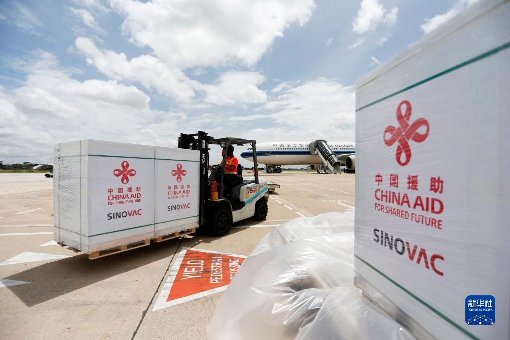 10月14日,工作人员在柬埔寨金边国际机场运输中国政府援助柬埔寨的科兴新冠疫苗。新华社发(批隆 摄)