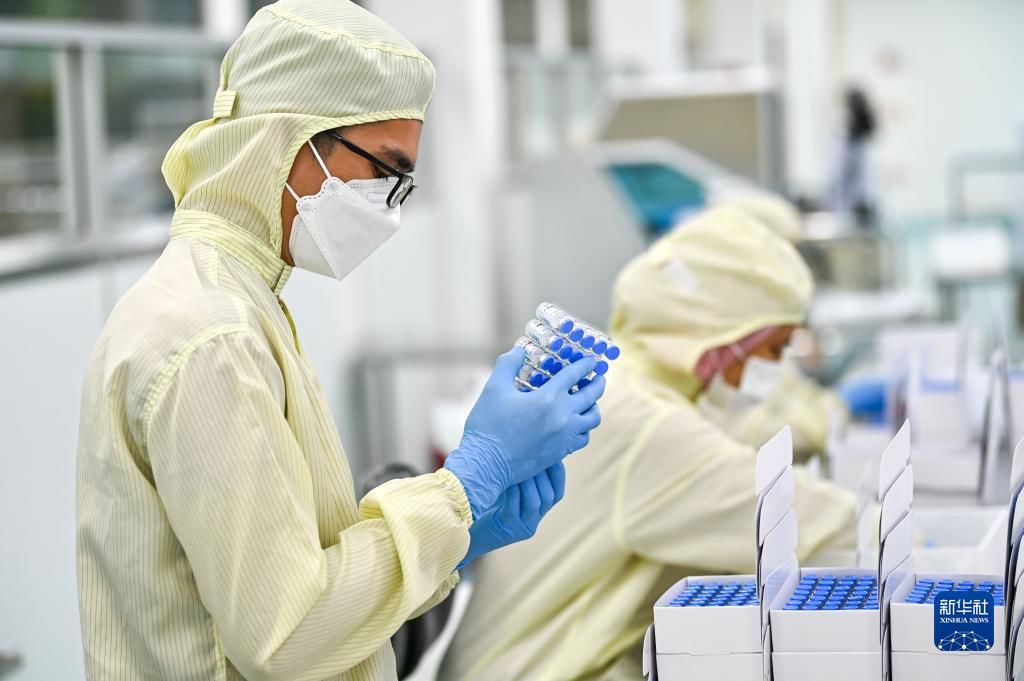 10月5日,在马来西亚吉隆坡郊区的发马公司灌装工厂,一名工人在包装本地灌装生产的科兴疫苗。新华社记者 朱炜 摄