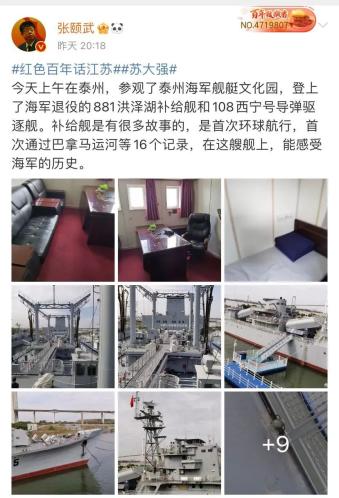 28日,参观了泰州海军舰艇文化园后,张颐武在微博上推文:“今天上午在泰州,参观了泰州海军舰艇文化园,登上了海军退役的881洪泽湖补给舰和108西宁号导弹驱逐舰。补给舰是有很多故事的,是首次环球航行,首次通过巴拿马运河等16个记录,在这艘舰上,能感受海军的历史。”