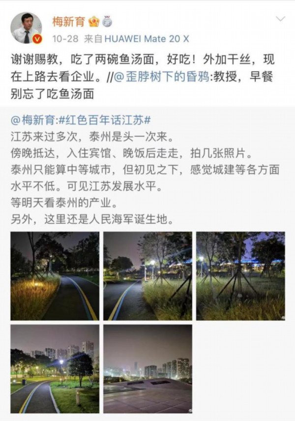 10月28日,梅新育在微博上图文并茂地点赞泰州城建、美食等方面。当网友提醒他要记得吃泰州的鱼汤面,他回复网友说:“吃了两碗鱼汤面,好吃!外加干丝......”