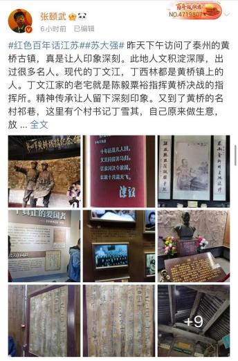 29日,张颐武在微博上再次图文并茂推发了自己参观黄桥古镇后的感受:“此地人文积淀深厚,出过很多名人。现代的丁文江,丁西林都是黄桥镇上的人。丁文江家的老宅就是陈毅粟裕指挥黄桥决战的指挥所。精神传承让人留下深刻印象。又到了黄桥的名村祁巷,这里有个村书记丁雪其,自己原来做生意,放弃这些,带村子告别贫困,看了村里的种种设施,感触很深。中国有不少村,都是一个有能力的人带领下改变面貌,这里的规律也是值得关注。”
