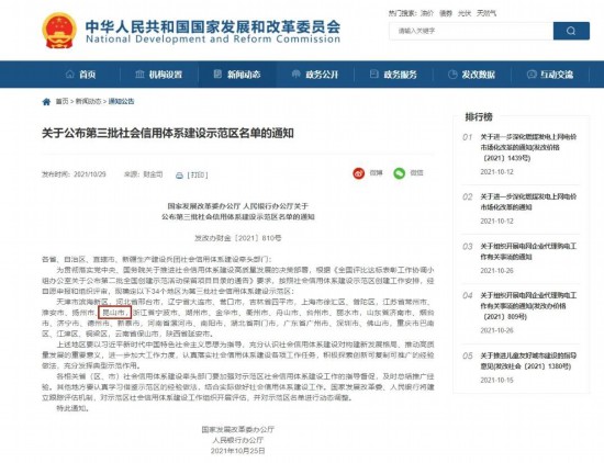好消息!10月29日,国家发展改革委官网发布,由国家发展改革委办公厅中国人民银行办公厅联合下发的《关于公布第三批社会信用体系建设示范区名单的通知》,全国34个地区被评为第三批社会信用体系建设示范区,昆山上榜,成为江苏省首个获此殊荣的县级市!