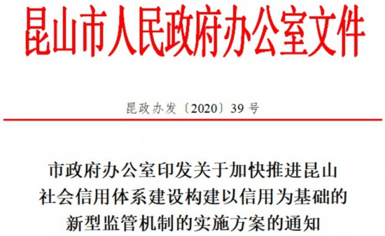 印发《关于加快推进昆山社会信用体系建设构建以信用为基础的新型监管机制的实施方案》《信用昆山共建行动实施方案(2021—2023)》等百余份文件,规范指引全市社会信用体系建设。