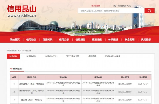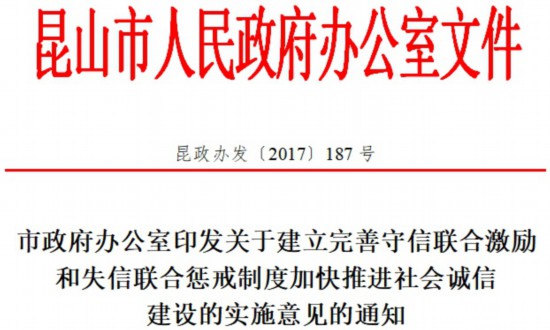 昆山先后获批全国守信激励创新试点城市、国家守信激励创新奖、全国优秀信用案例和信用应用场景微视频征集最佳传播效果奖,并连续两年获评省政务诚信一等次。