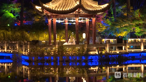 南京栖霞山风景区工作人员蔡晖介绍:“在主景区的明镜湖湖心亭,有古风的琵琶演奏,游客在桃花扇亭栈道游玩的时候,远远地就可以听到演奏,给大家赏夜枫,增添了氛围感。”