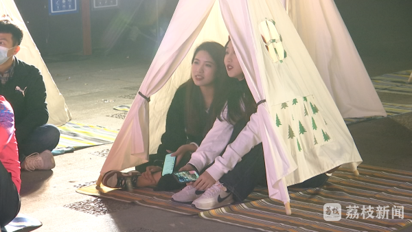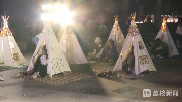 随后,记者来到了山下的主景区,这里也非常热闹,正在举行的是"夜枫主题音乐会",大家可以在摄山夜肆边逛边听歌,也可以选择一顶帐篷,用露营的方式,感受音乐的魅力。