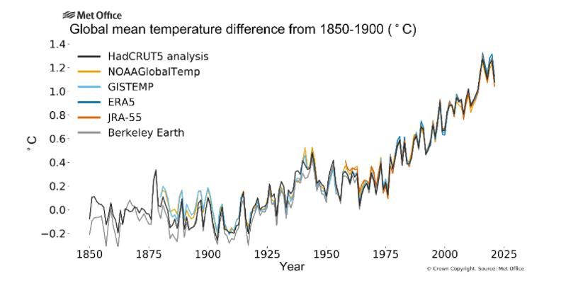 世界气象组织声称,“创纪录的”大气温室气体浓度和热量积累已经将地球“推向未知的领域”,并将对今世和后代“产生深远的影响”。据报告统计数据显示,2021年全球平均气温(1月至9月)较1850至1900年高出约1.09摄氏度,目前被世界气象组织列为全球有记录以来第六个或第七个最温暖的年份。该报告称,2020年全球温室气体浓度已达到新高,二氧化碳、甲烷和氧化亚氮的浓度分别比工业化前高出149%、262%和123%,而这种增长在2021年仍在继续。