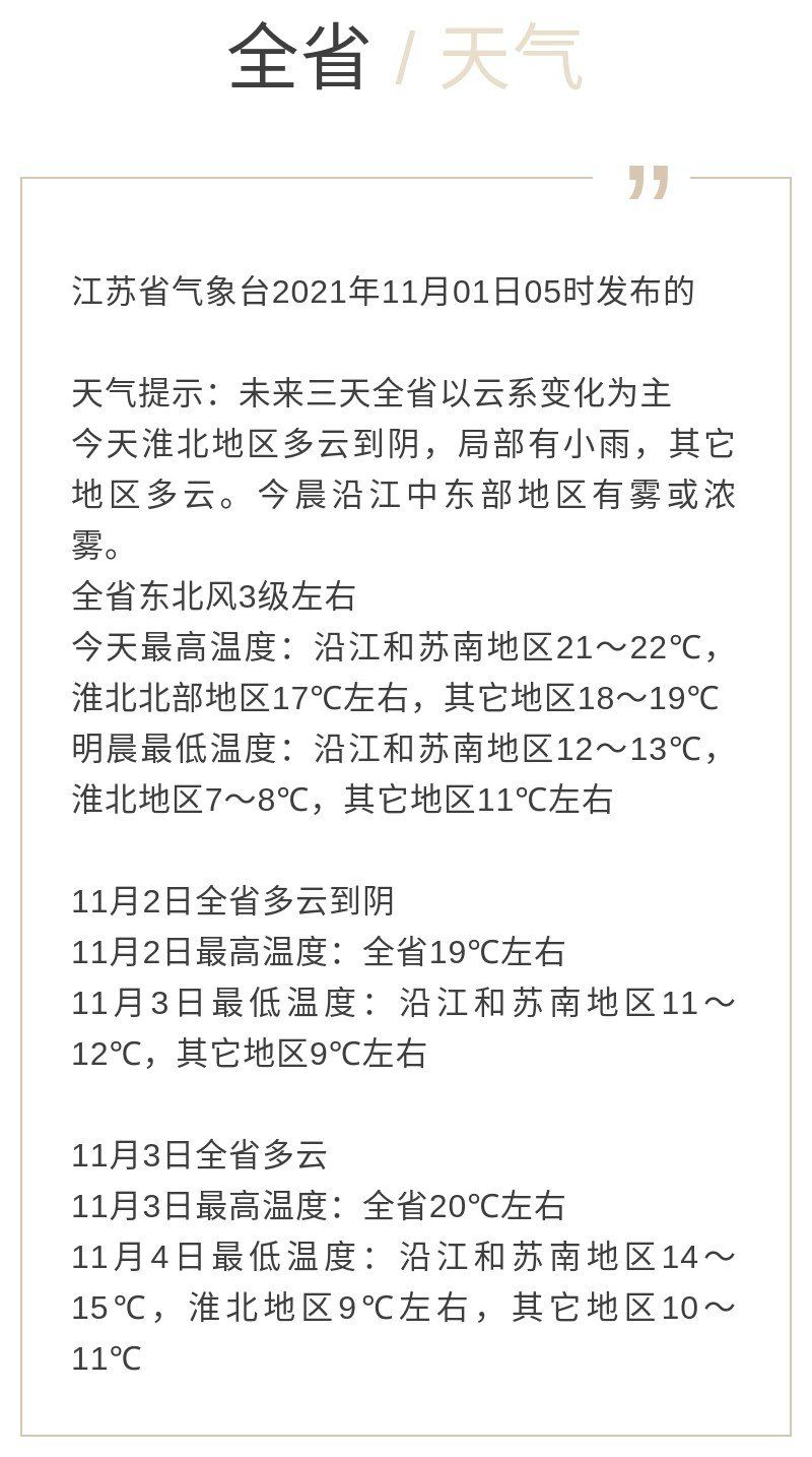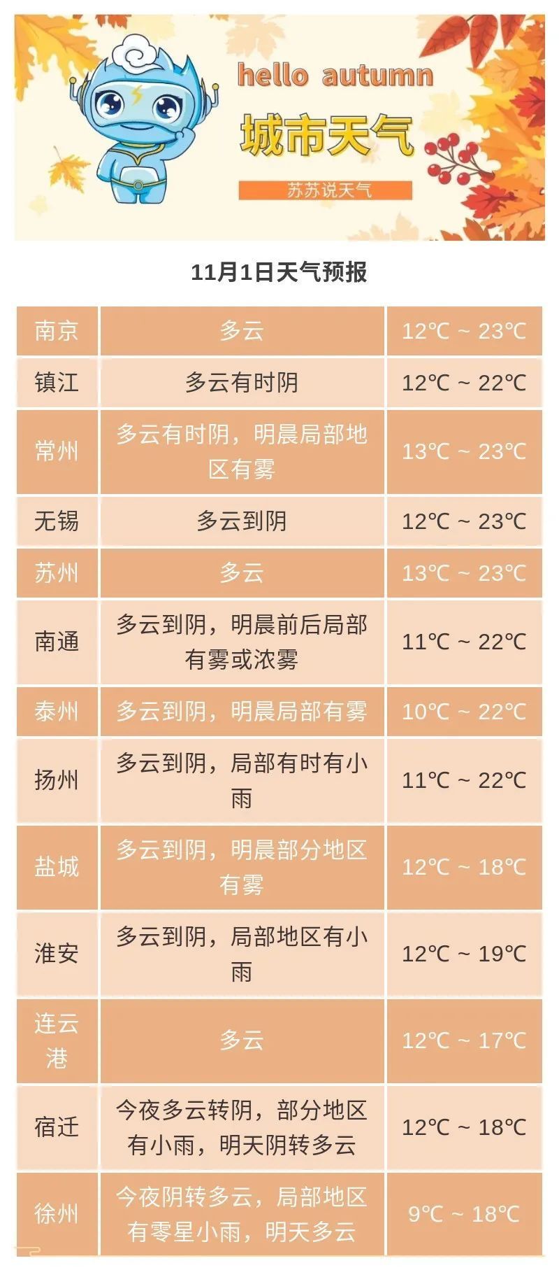 据江苏省气象台,今天(11月1日)淮北地区多云到阴,局部有小雨,其它地区多云。今晨沿江中东部地区有雾或浓雾。全省东北风3级左右,今天最高温度:沿江和苏南地区21~22℃,淮北北部地区17℃左右,其它地区18~19℃,明晨最低温度:沿江和苏南地区12~13℃,淮北地区7~8℃,其它地区11℃左右。