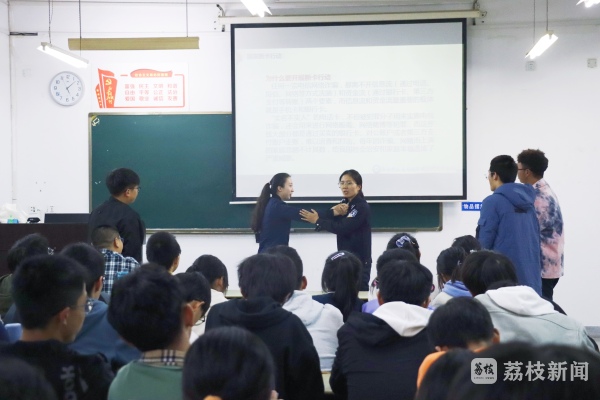 女子特战队党支部书记、分局反诈中心负责人、网安大队副大队长孙汉琪在讲授保护人身安全的时候,在课堂上教起了格斗防身术,一招一式让同学们很感兴趣,纷纷想要上台体验。女子特战队党支部宣传委员、大学城警务室教导员郭雯发挥天津人特有的幽默感,生动有趣的语言不时引得同学们的大笑,活跃的课堂氛围也加强了学生对反电诈知识的记忆。而女子特战队队员、枚乘路派出所综合室副主任王梦彤则是通过讲述发生在同学们身边的真实案例,讲解电信诈骗的常见手段和防范技巧,让他们加深对反诈知识的理解。